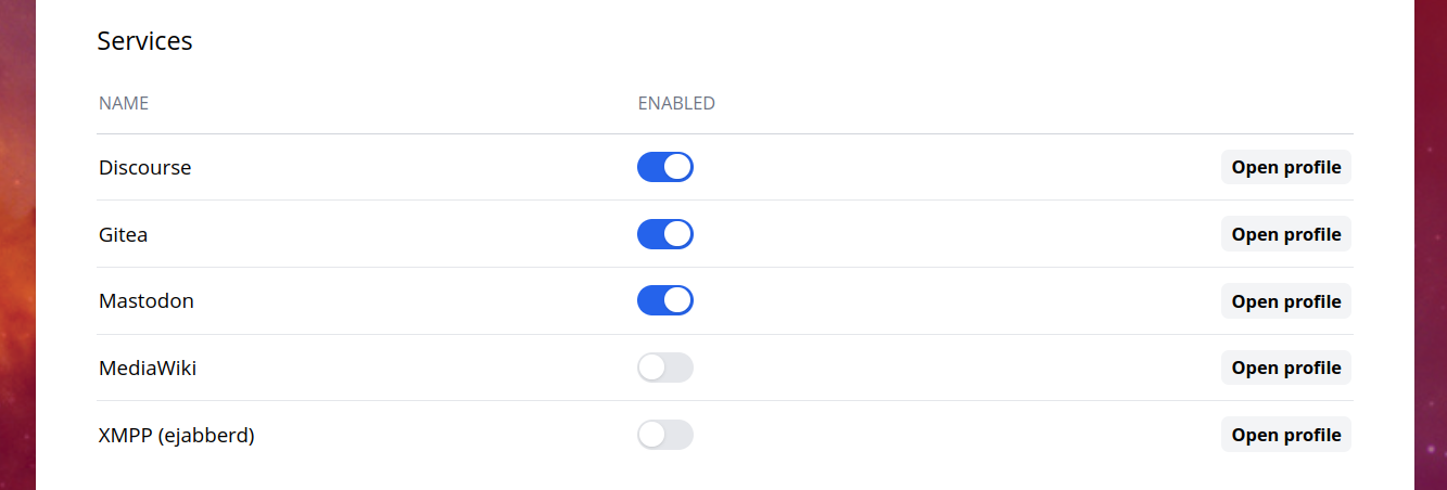 This started out just wanting to add some toggle switches and user profile links to the admin user page, and then ended up adding a bunch of re-usable form components for toggles and other input fields, while adding all current service settings to the admin panel.