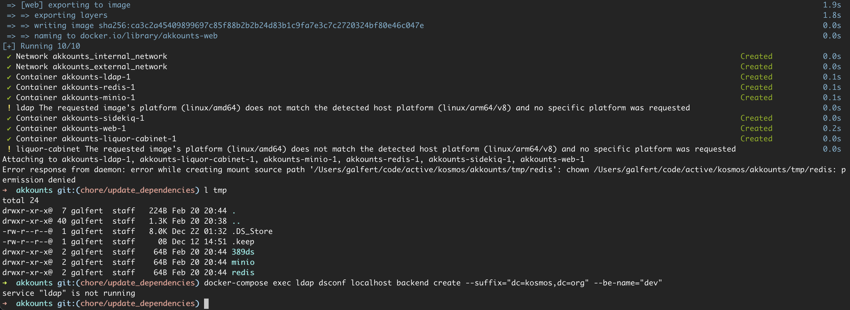 chownon a directory it created itself.That's actually similar to what I suspect is the issue on @greg's (Intel-based) Mac (albeit with the LDAP container there). Maybe @slvrbckt has an idea for how to proceed? Unfortunately, I do not have a Mac, so I am unable to debug macOS-related Docker issues. :/